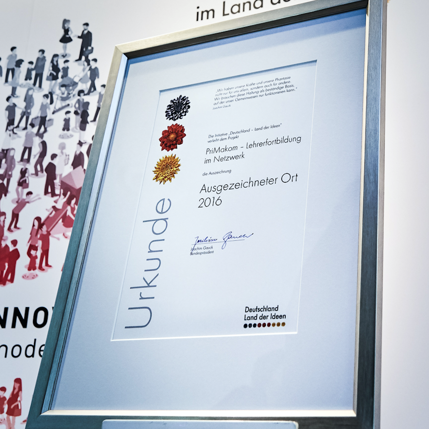 2016: Das DZLM-Projekt "Primarstufe Mathematik kompakt" (PriMaKom) ist Preisträger des bundesweiten Innovationswettbewerbs "Ausgezeichnete Orte im Land der Ideen" 2016. PriMaKom ist ein Gemeinschaftsprojekt der TU Dortmund, Mitarbeitern der TU Braunschweig und HU Berlin.